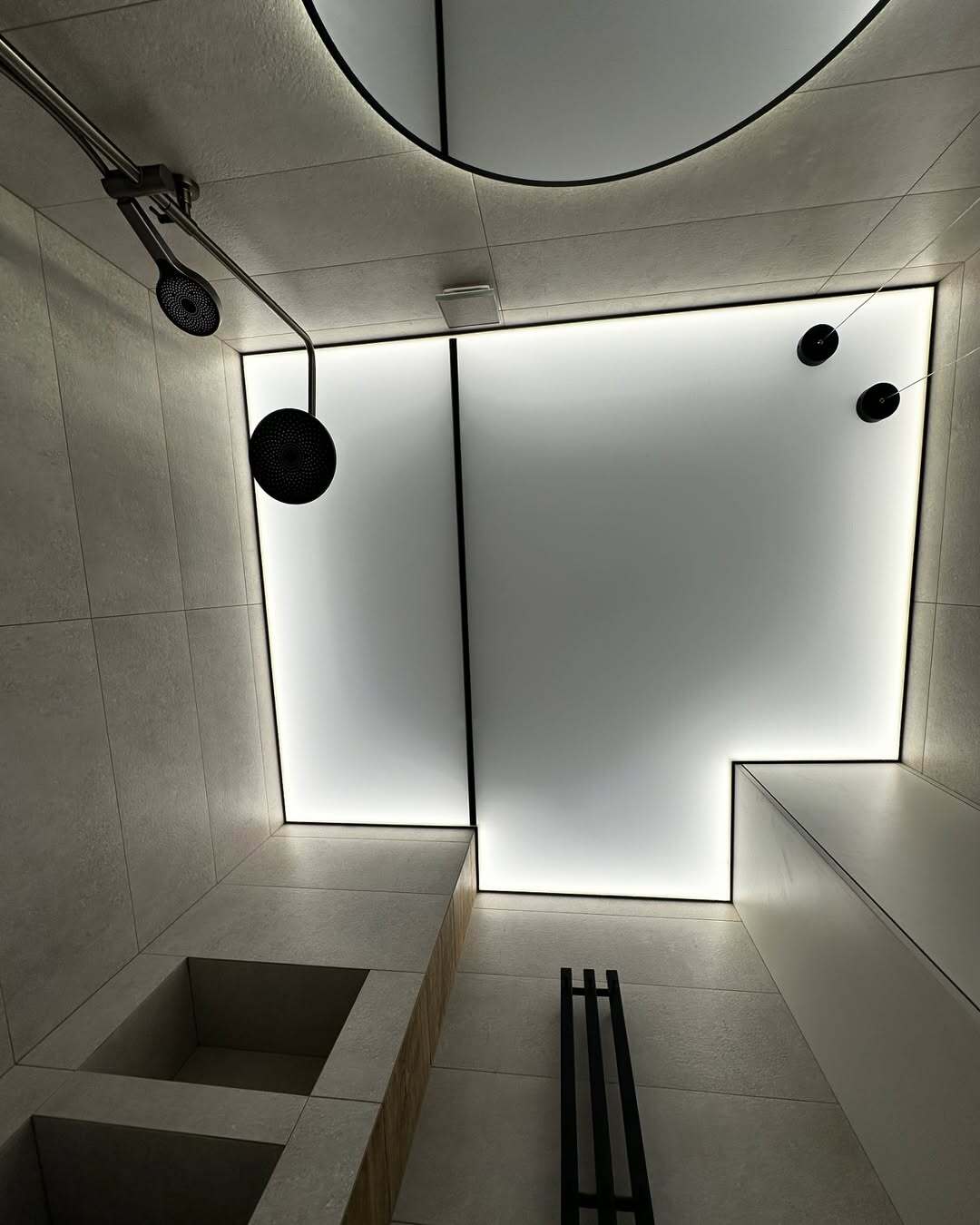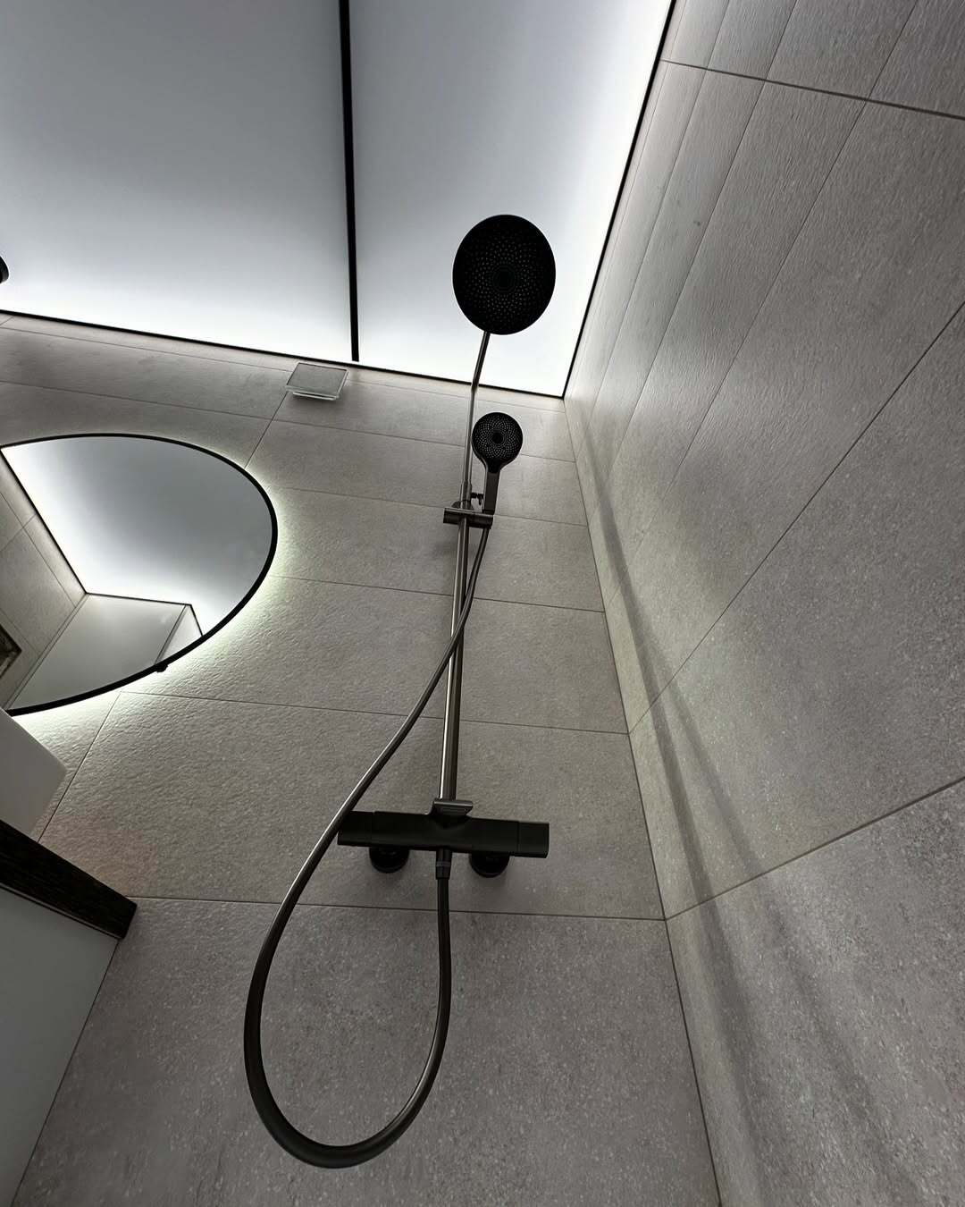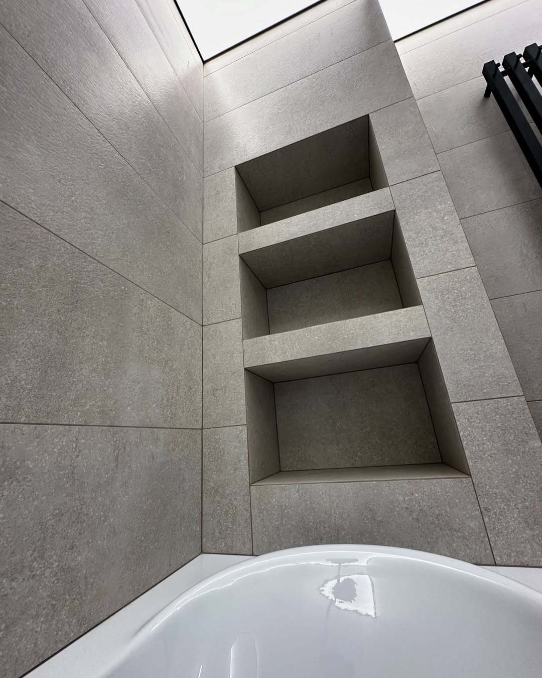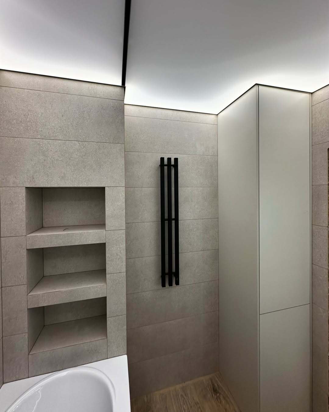 💧 Завершили еще один проект по комплексной отделке ванной комнаты 4 м² в квартире на Шмитовском проезде. Для стен использован крупноформатный керамогранит 400х1200 мм под камень с рельефной текстурой, что добавило интерьеру глубины и стиля. Над ванной наращена стена на 100 мм, чтобы создать функциональные полки и визуально выделить эту зону.