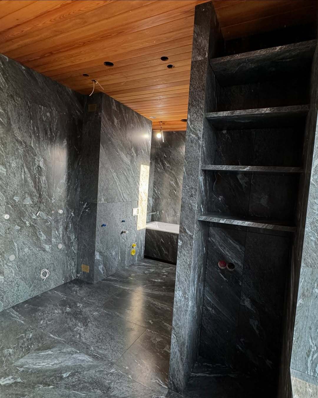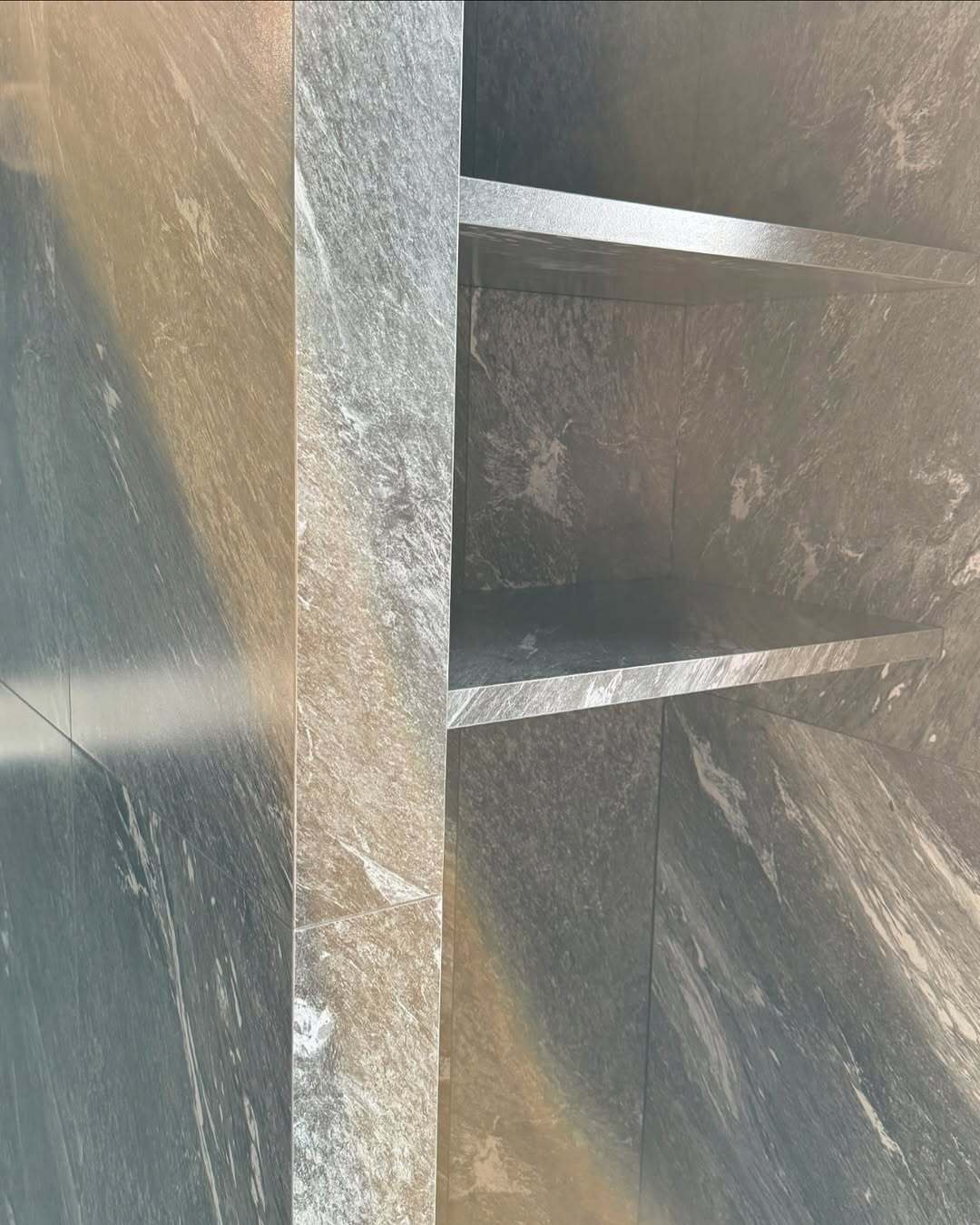В интерьере использован керамогранит размером 120x60 см, что придаёт помещению современный и стильный вид. Были собраны душевой поддон под плитку и изготовлен экран под ванну с нишей для ног, что обеспечивает функциональность и эстетичность.