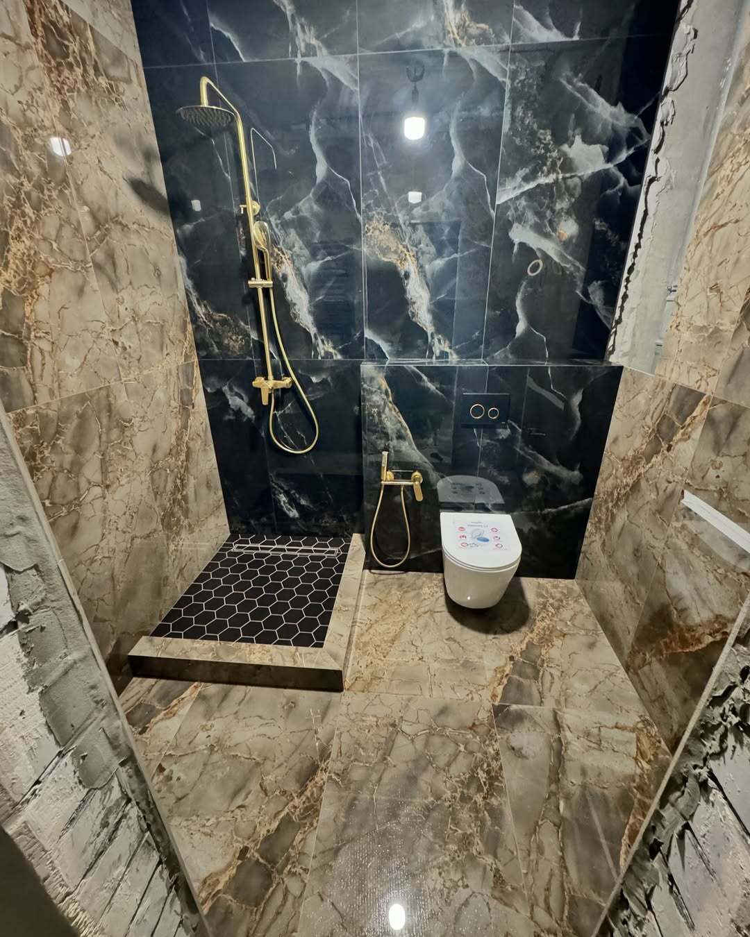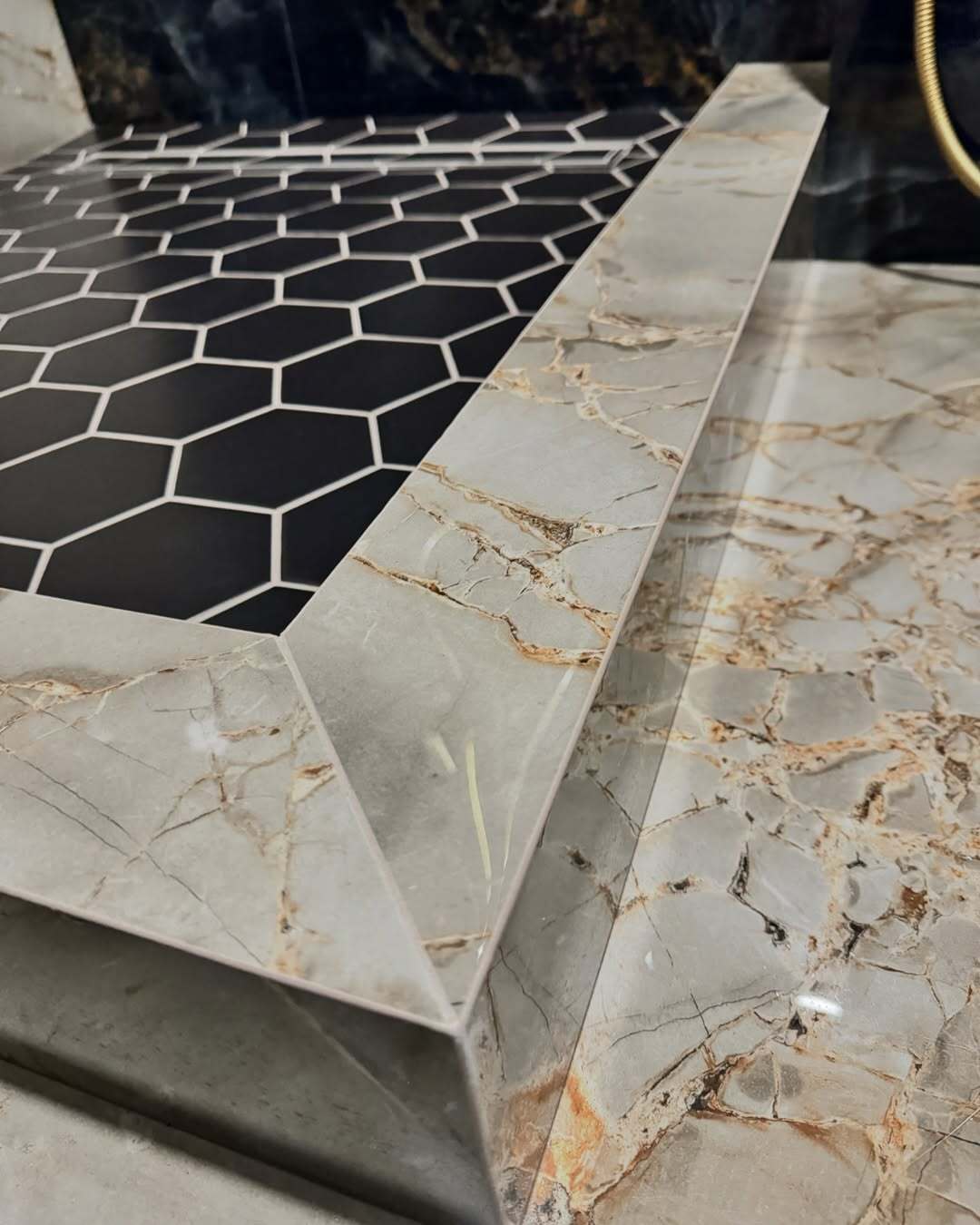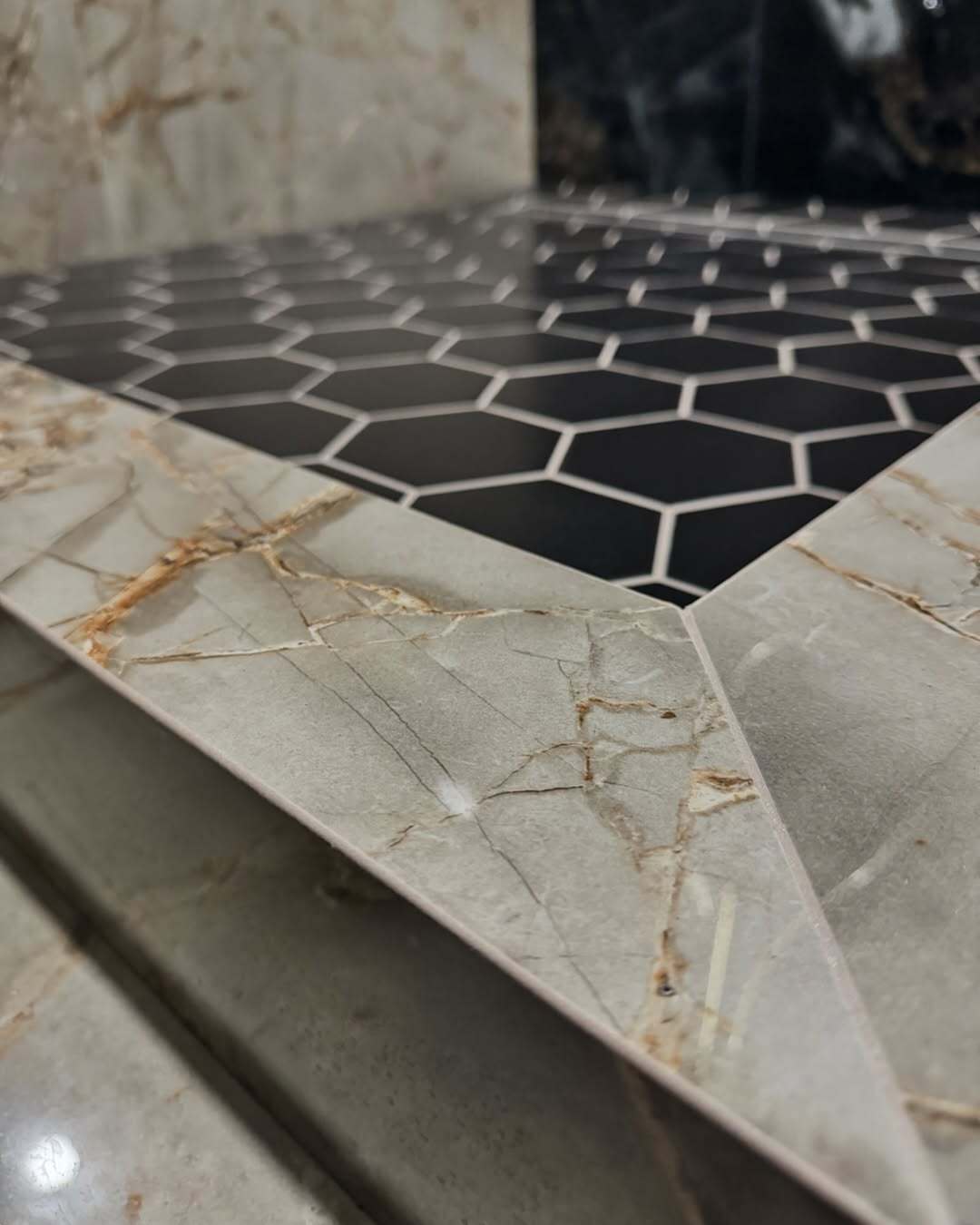 • Душевой поддон: Мы выбрали лучшие образцы керамогранита и разработали уникальный дизайн душевого поддона, что делает этот санузел не только красивым, но и удобным в использовании.
