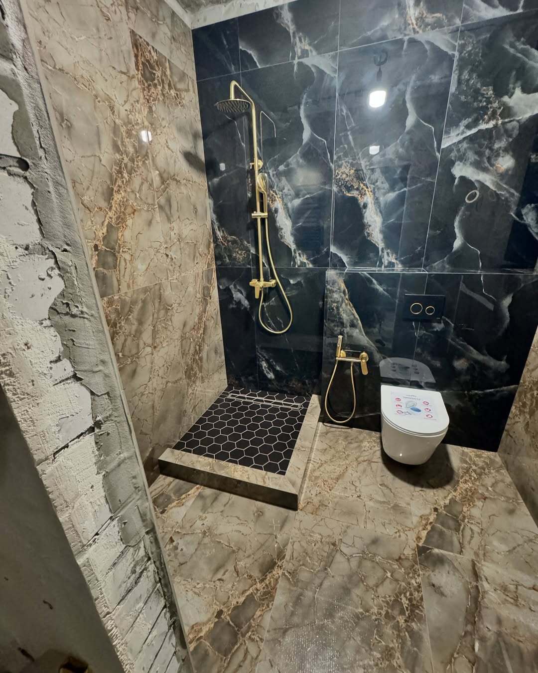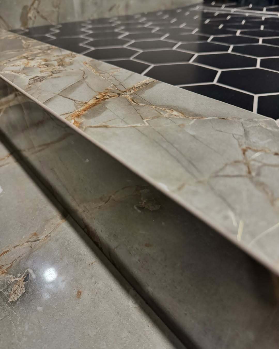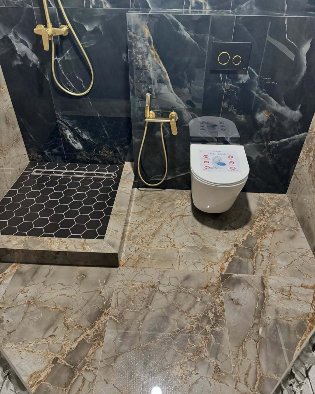 • Душевой поддон: Мы выбрали лучшие образцы керамогранита и разработали уникальный дизайн душевого поддона, что делает этот санузел не только красивым, но и удобным в использовании.