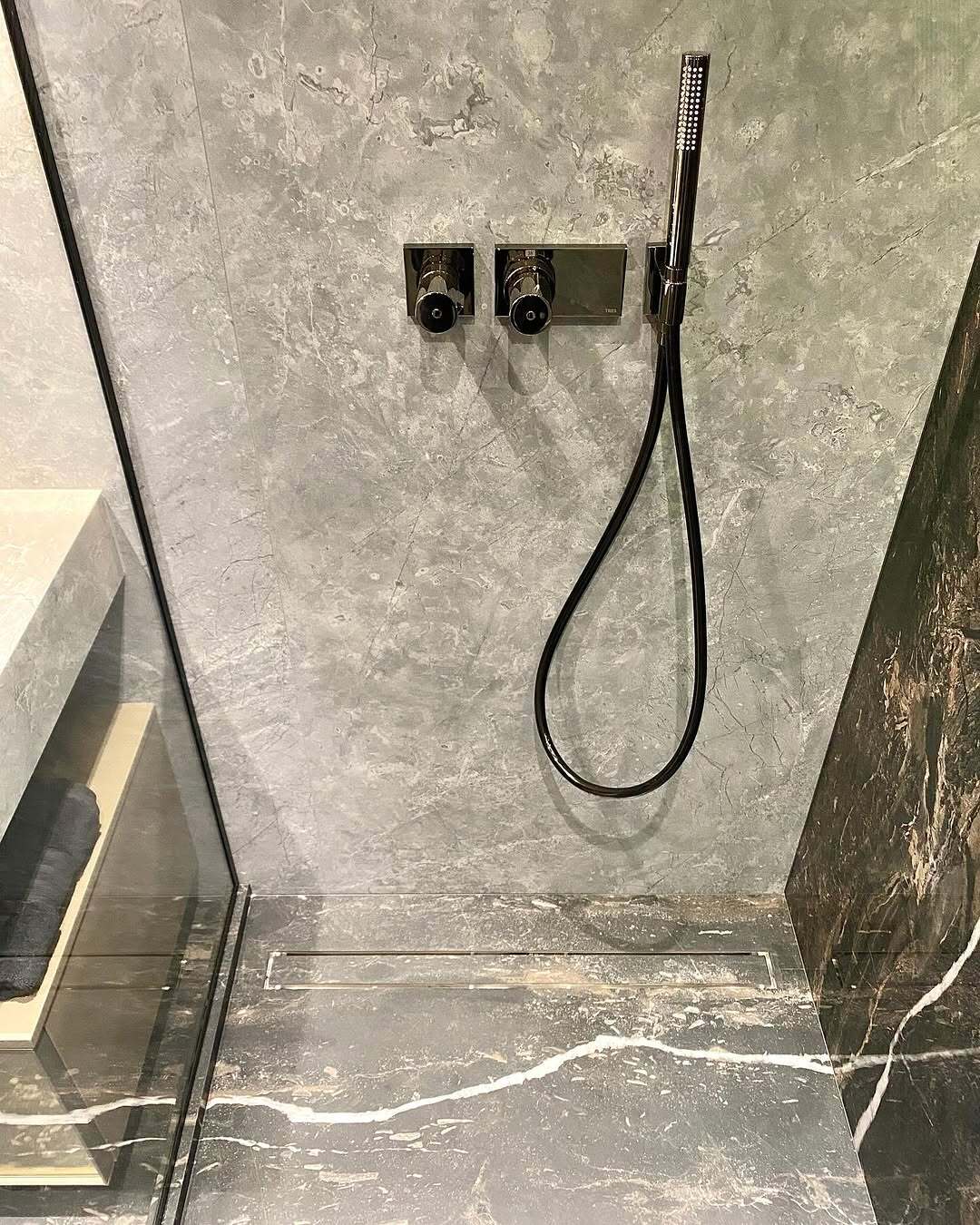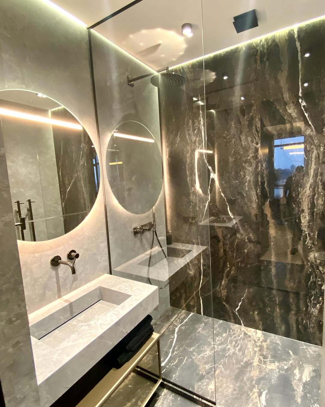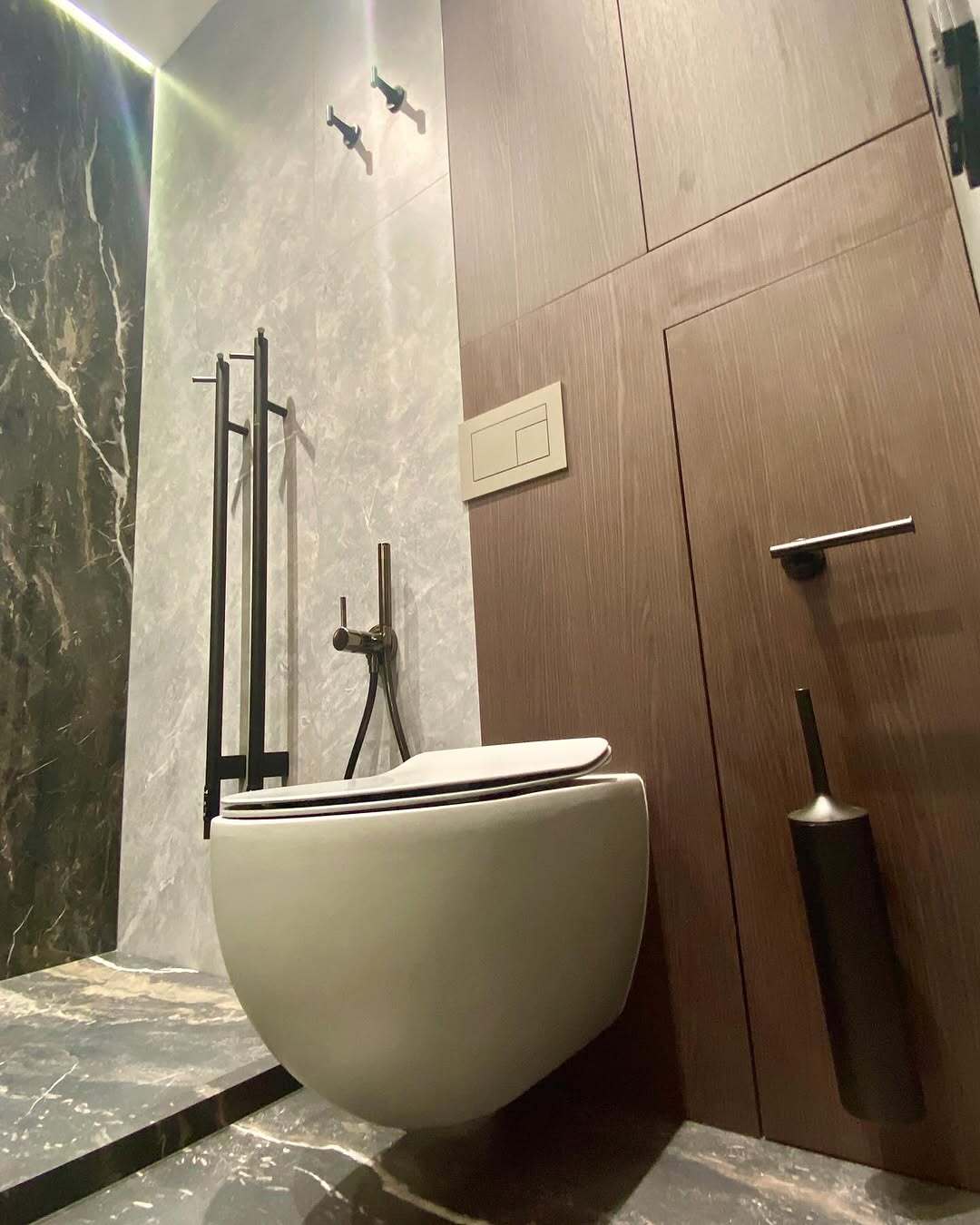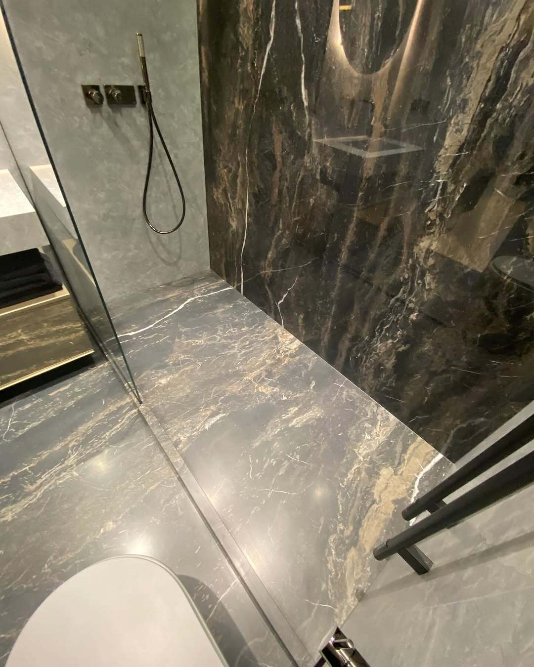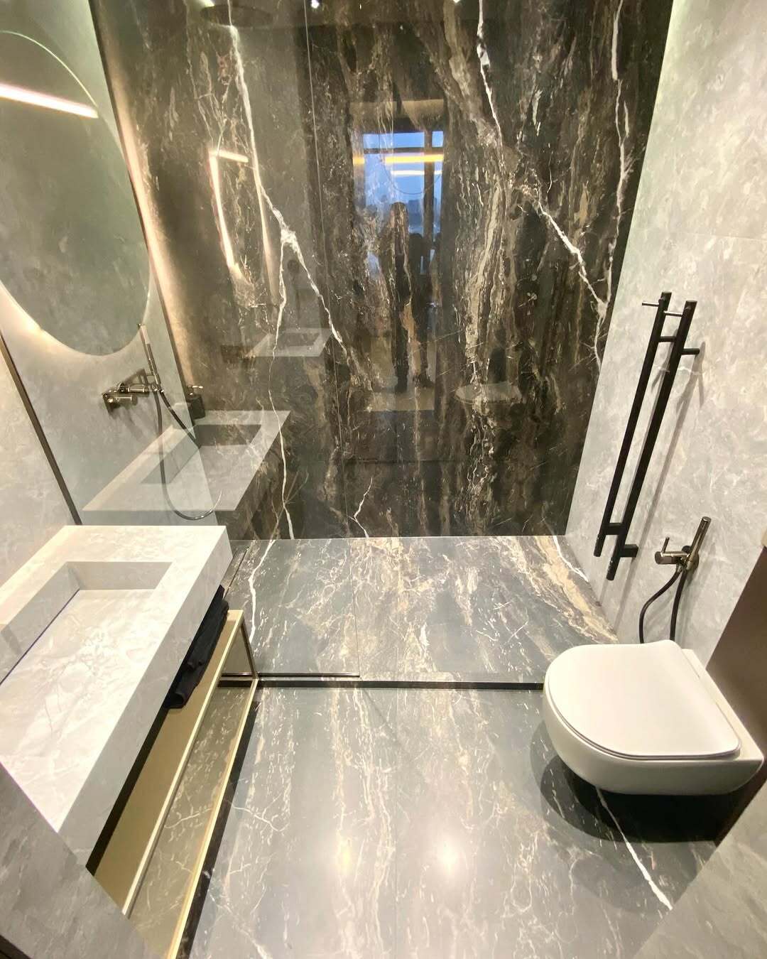 💬 Завершена комплексная отделка совмещенного санузла 4,8 м² в новостройке на Овчинниковской набережной. В интерьере использован широкоформатный керамогранит 280х120 см в двух цветах: темно-коричневый с прожилками и светло-серый, что создает гармоничный контраст.
