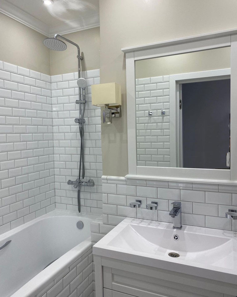 Ванная в белых тонах. Спокойно, чисто, нет ощущения перегруженности. При этом за простотой внешнего вида стоит сложная работа с раскладкой и стыковкой материалов.