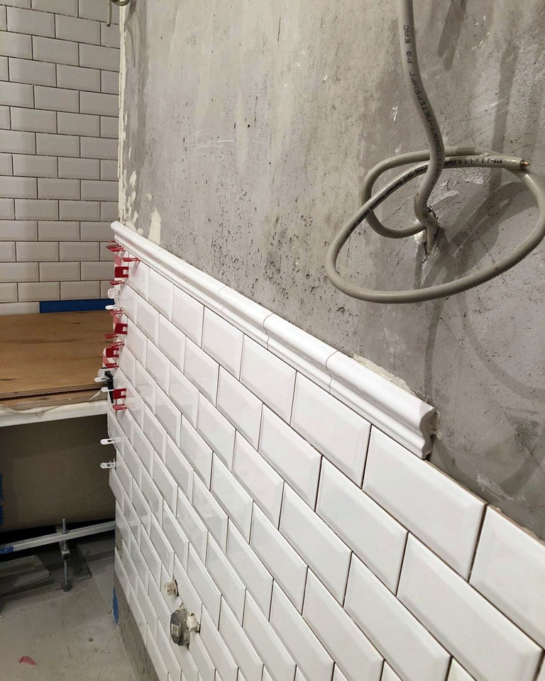 На полу — мелкий формат 12×12 с аккуратными вставками по центру. Стены: часть выложена кабинчиком, дальше идёт плавный переход в покраску. Разделяет их бордюрный фриз — чётко, аккуратно, без визуального шума.