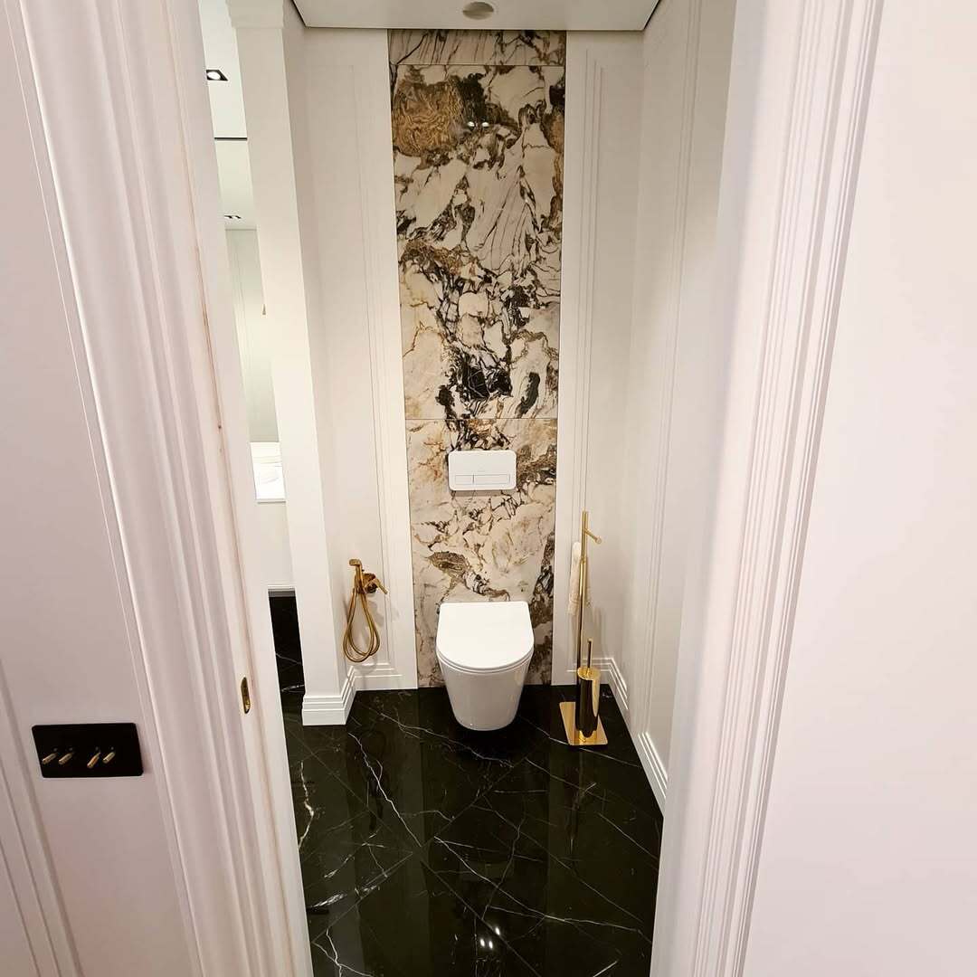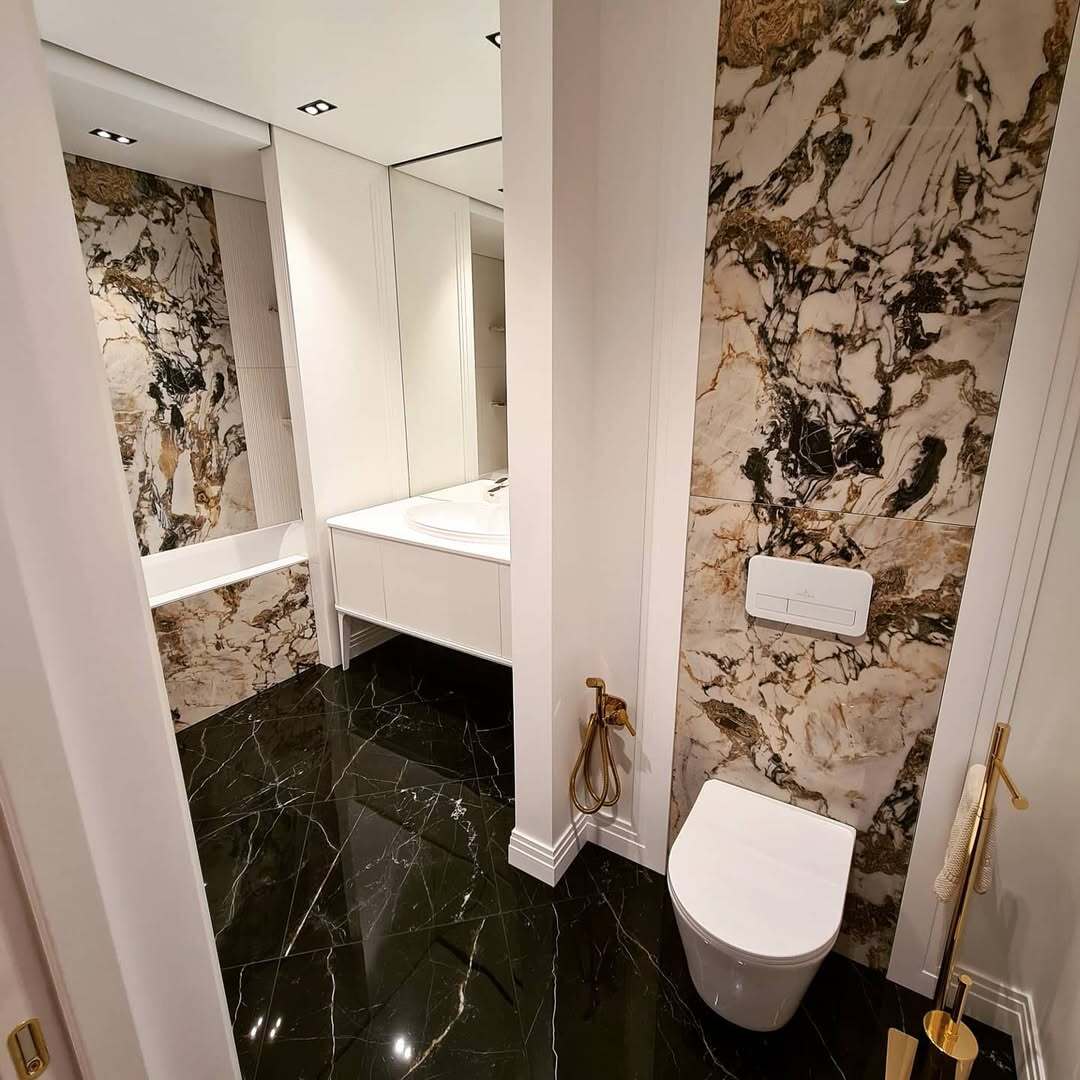 👀 Мы реализовали сложный проект с безупречной отделкой ванной комнаты и немного в прихожей. В работе использовалось два вида керамогранита: на стены — крупноформатный 1200×600 мм, а на пол — темный керамогранит 600×600 мм, уложенный по диагонали для эффектного визуального восприятия.