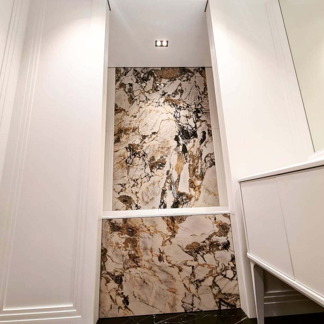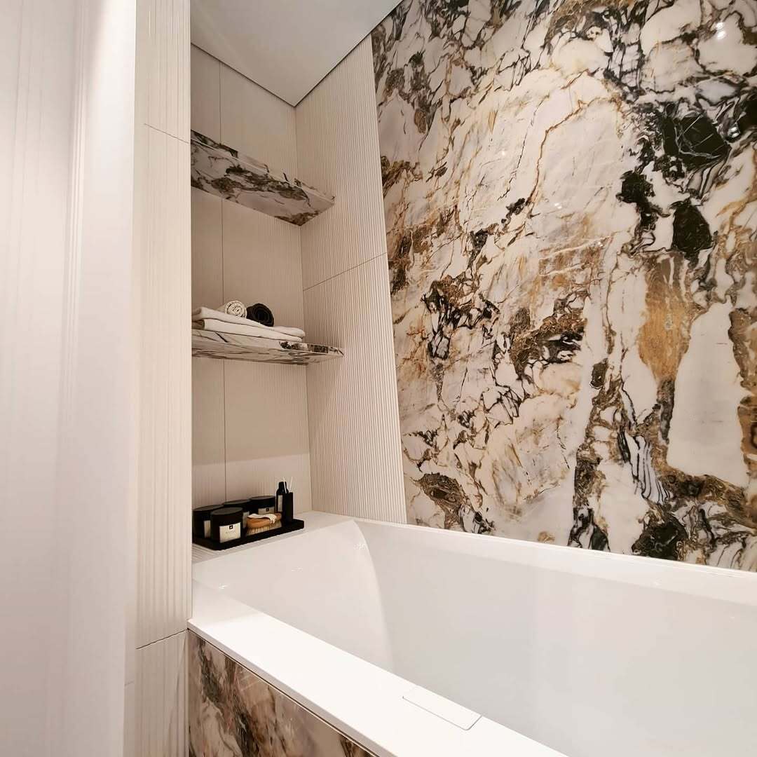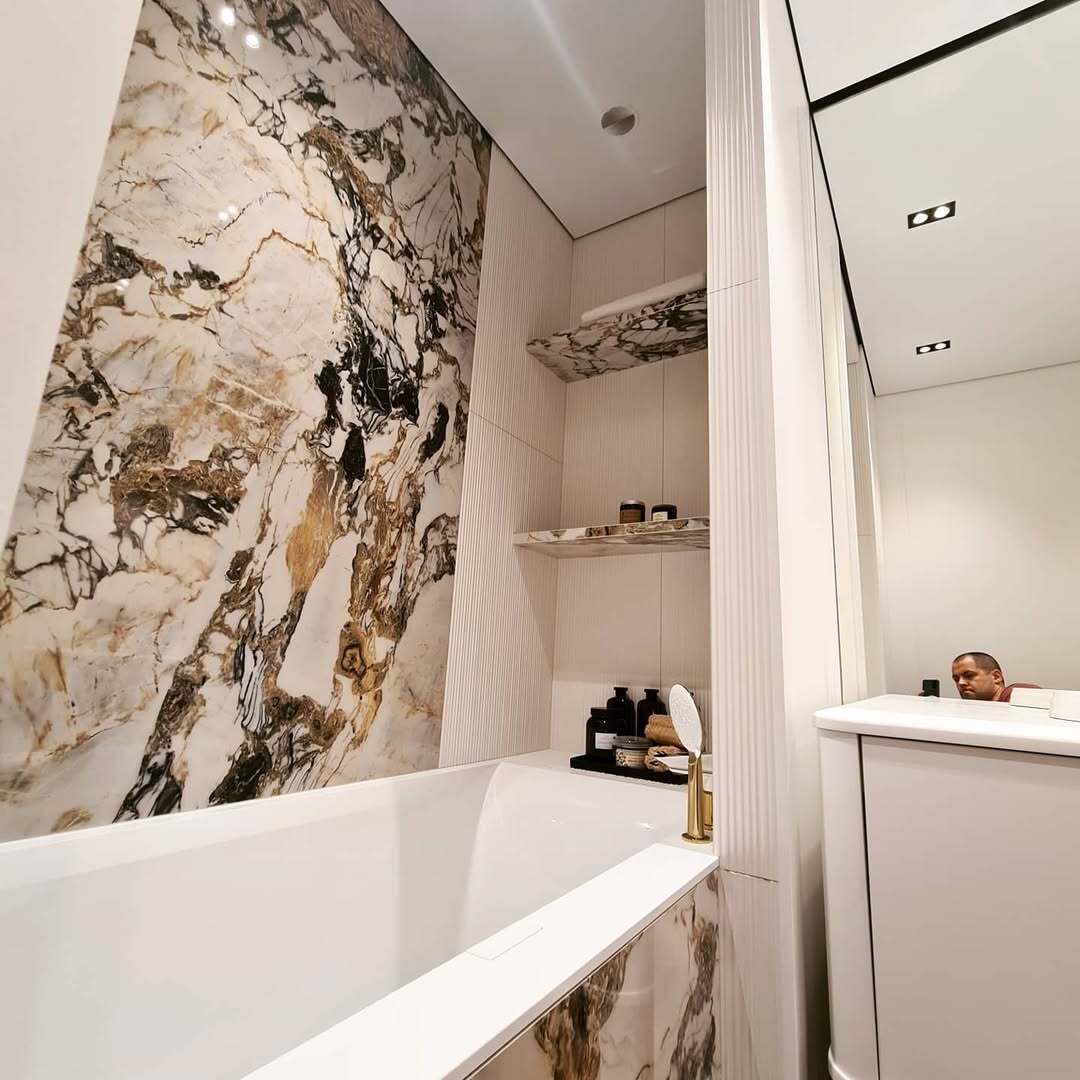 - Две встроенные полки из керамогранита в нише, изготовленные вручную для идеальной подгонки.