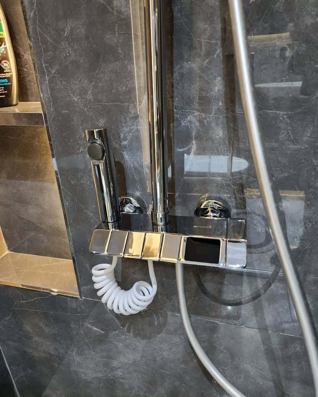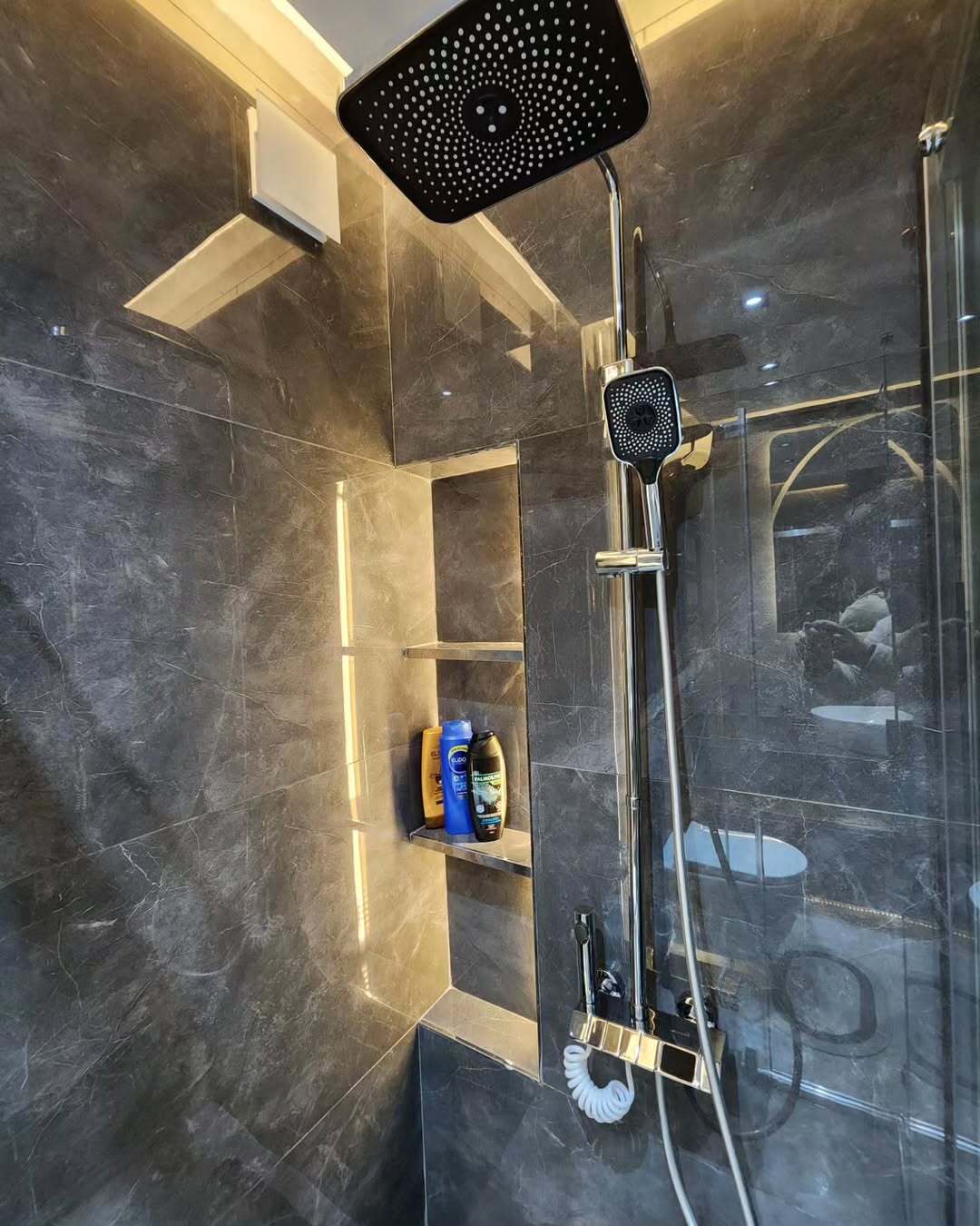 Элегантная отделка керамогранитом 60 на 120 в совмещенном санузле.