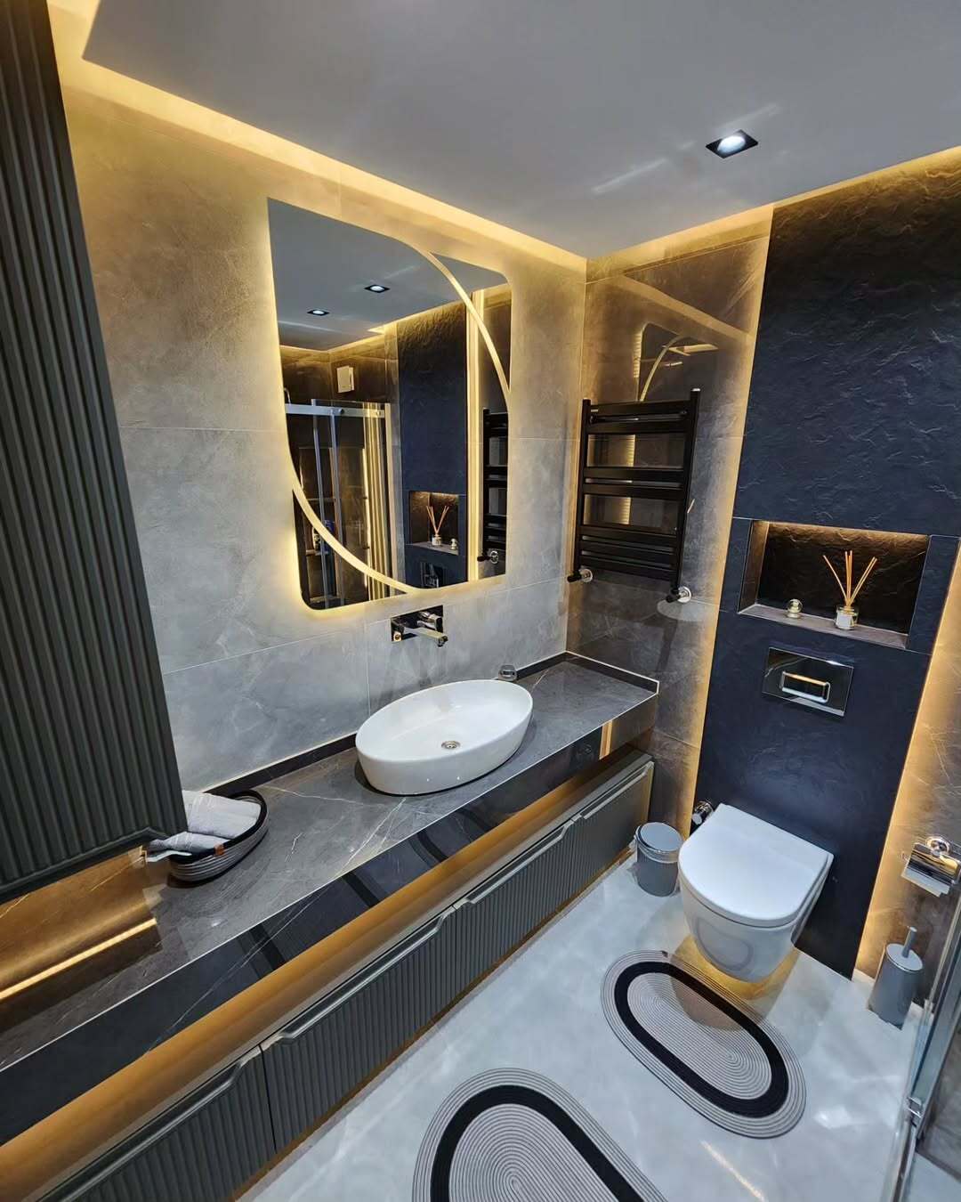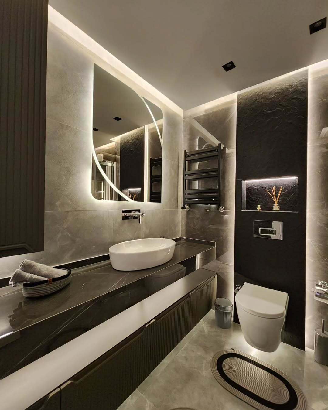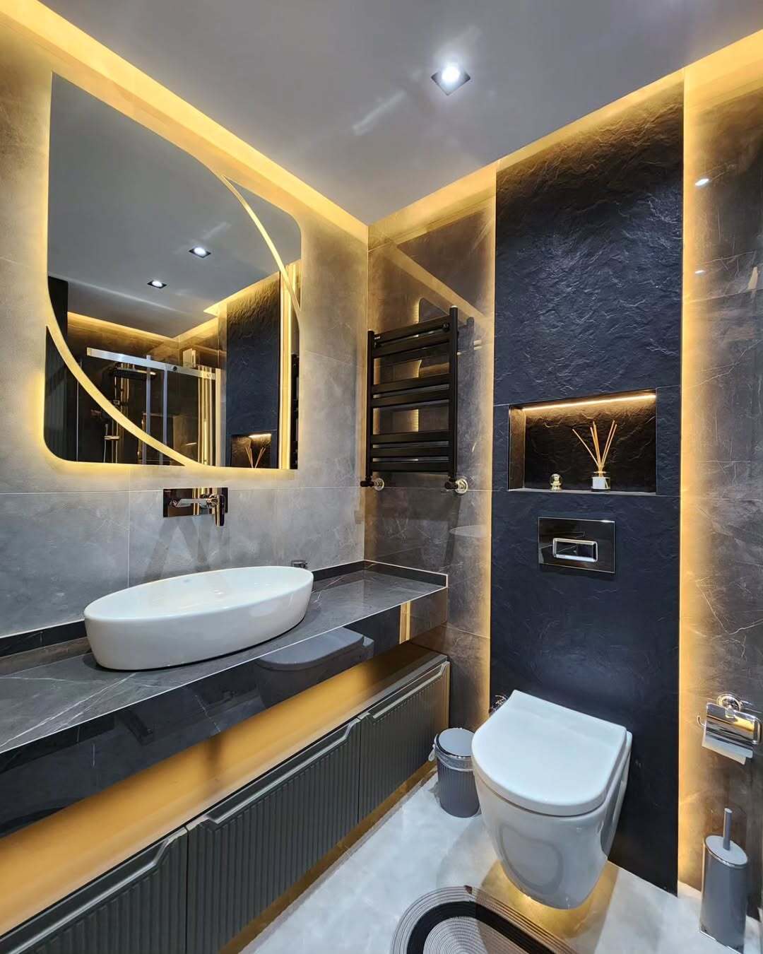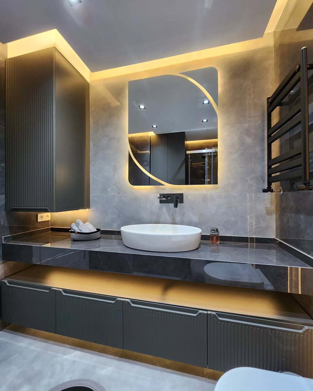 - Линейная диодная подсветка по мебели и периметру ванной добавляет изысканности и комфорта.