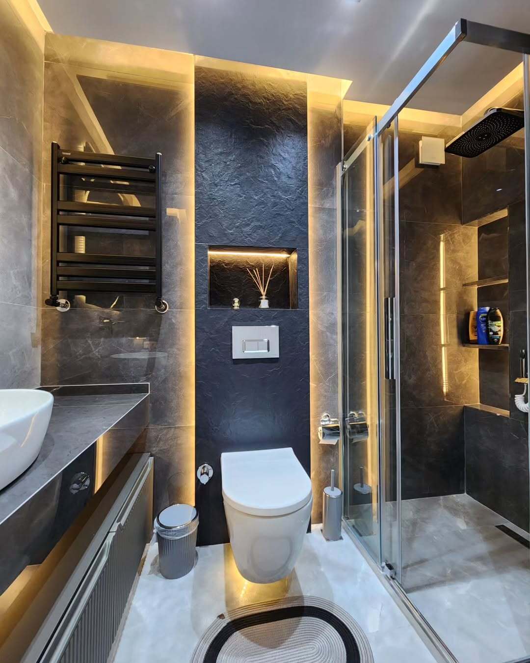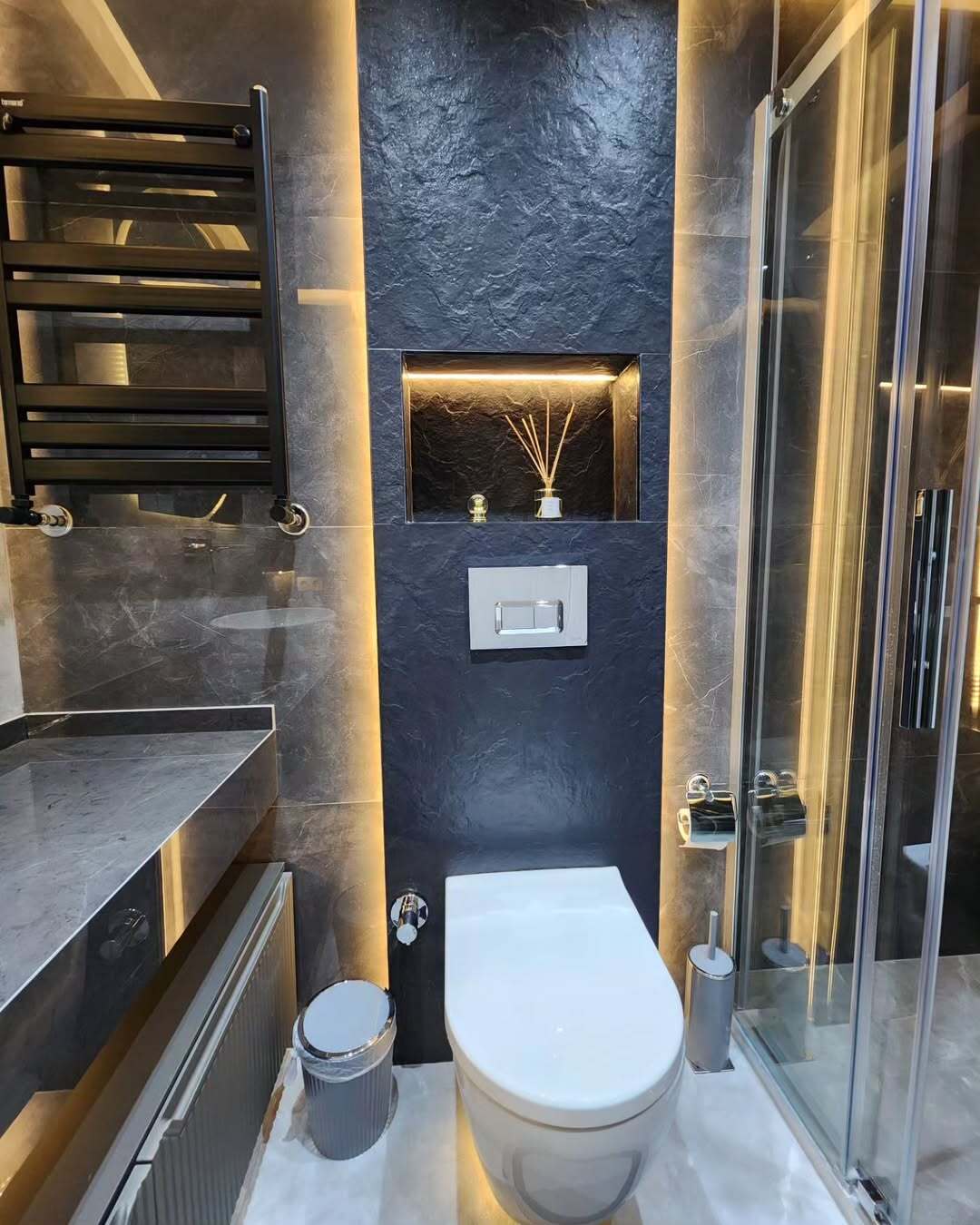 Основной акцент сделан на керамогранит под камень в серых и темных оттенках, который создает атмосферу уюта и современности.
