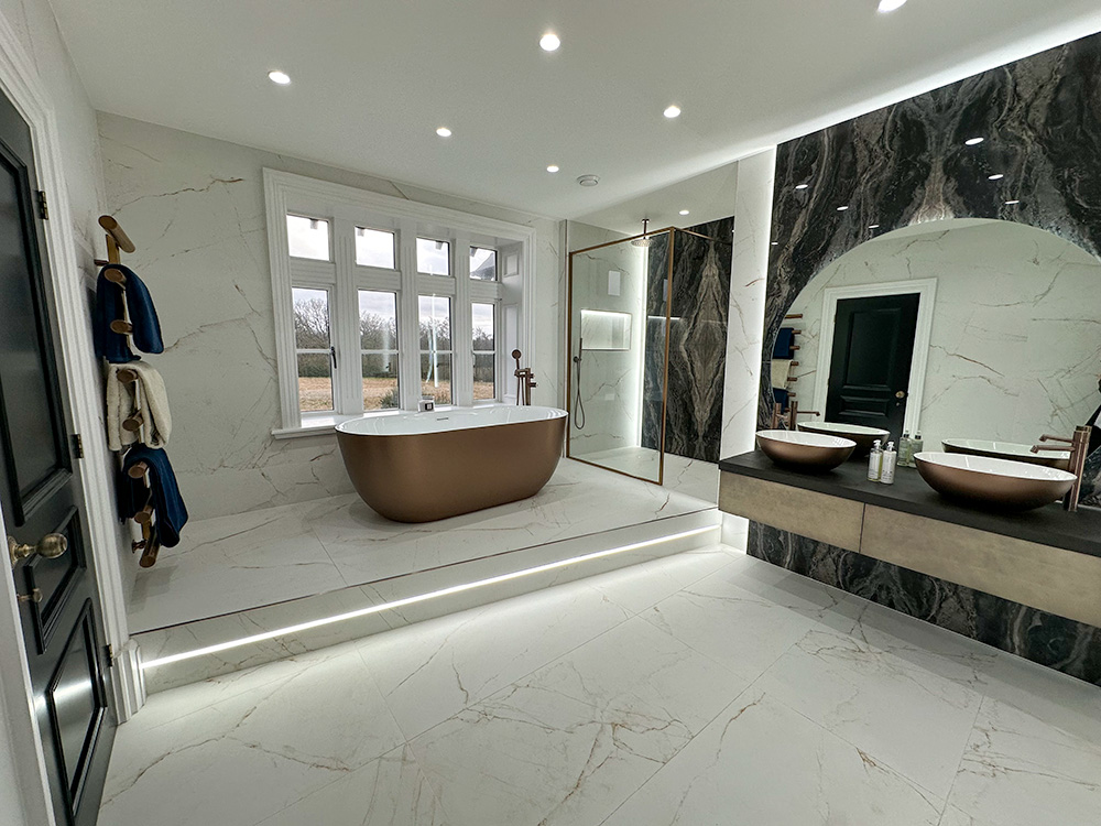- Плитка Bookmatch Orobico и мрамор с бронзовым оттенком создают гармоничный и эффектный фон.