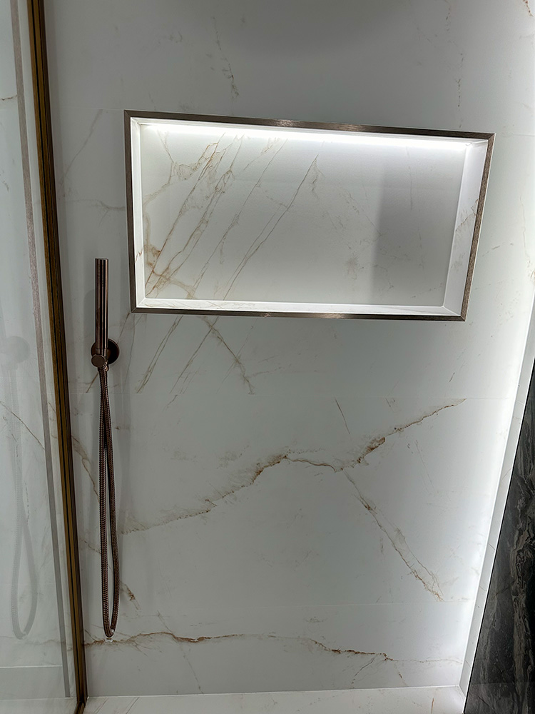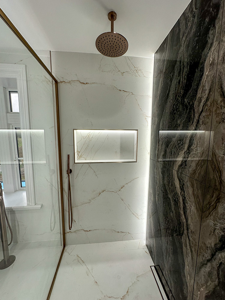 - Душевая зона с матовой бронзой и мрамором подчеркивает единство стиля.