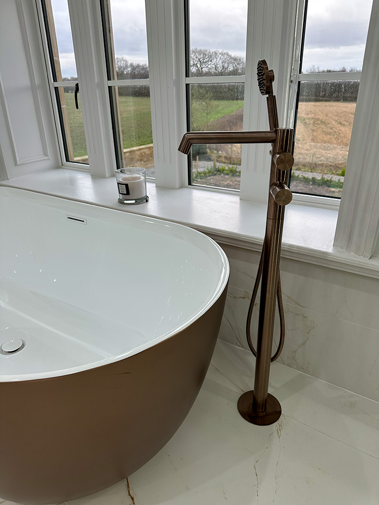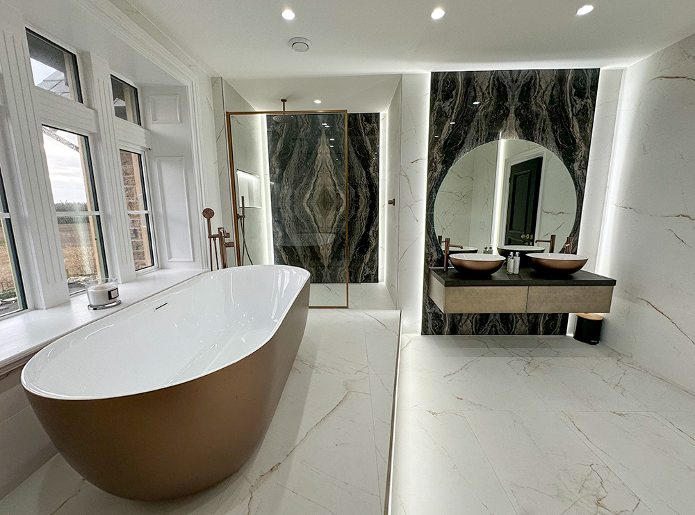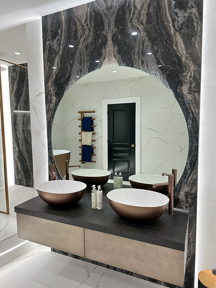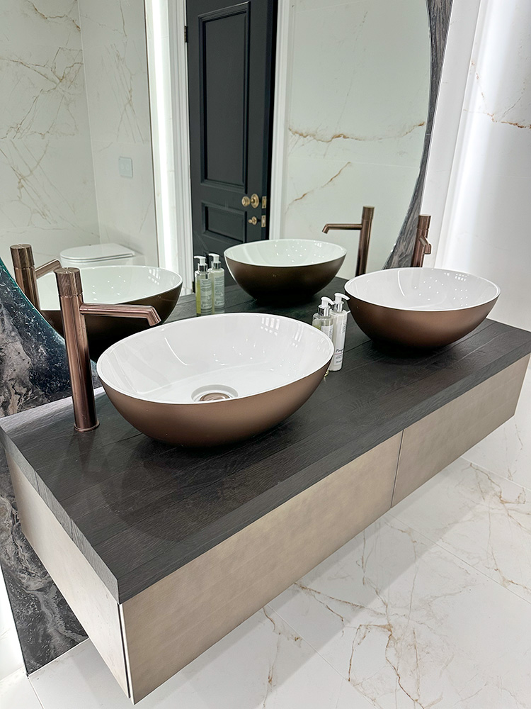 - Отдельно стоящая ванна и раковины в бронзовом цвете стали центральным акцентом.